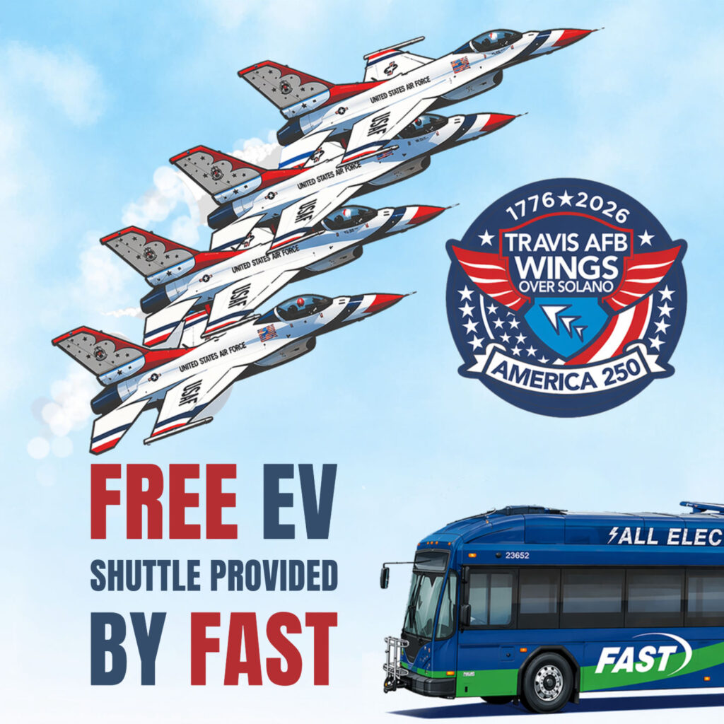 Wings Over Solano is this weekend, April 25 and 26, and FAST is providing free EV shuttle buses to get you there and back without the parking headache. Shuttle picks up at the Tom Hannigan Fairfield-Vacaville Station every 20 minutes starting at 9:00 AM. The last inbound pickup is at 3:30pm, so plan accordingly since the show closes to new entry after that. After the show, shuttle starts running again at 5:00 PM to bring you home. Just a heads up. Real ID or two forms of government issued ID are required to get on base. Make sure you have that before you head out.